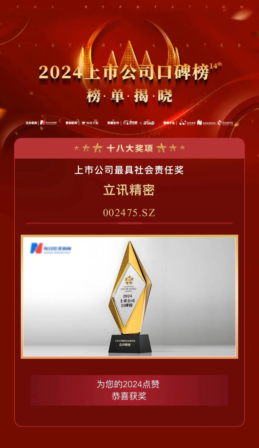 12月6日,每日经济ag(中国)隆重揭榜“2024第十四届中国上市公司口碑榜”。立讯精密成功入围榜单并获“上市公司20年非凡跨越奖”和“上市公司最具社会责任奖”两大权威奖项。