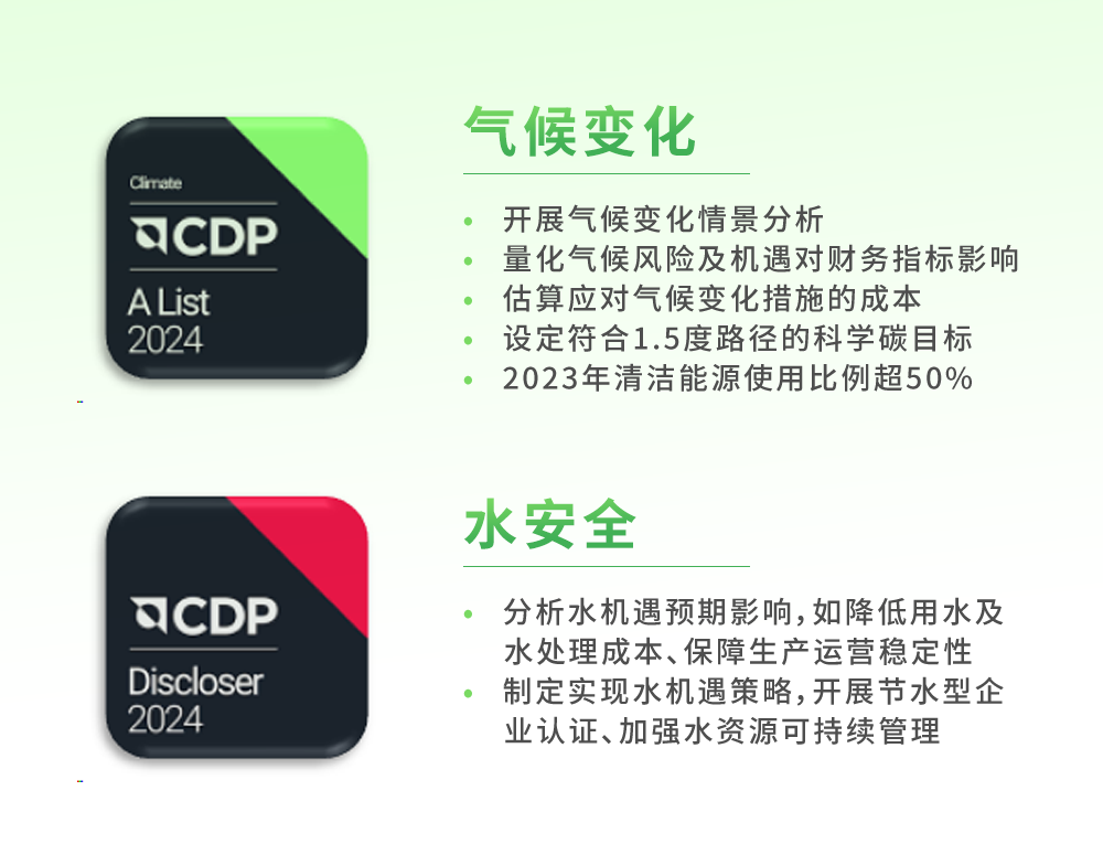 全球环境信息研究中心(CDP)评级,被广泛视为衡量企业环境透明度和可持续发展行动的重要基准,覆盖全球超22000家公司。近日,CDP公布2024年评级结果,立讯精密评级连续四年稳步提升,在气候变化领域获评「A」级、水安全领域获评「A-」级,双双位列全球领导力等级,这一突破高度认可了立讯精密在气候变化的应对和水资源的可持续利用方面的努力和成果。